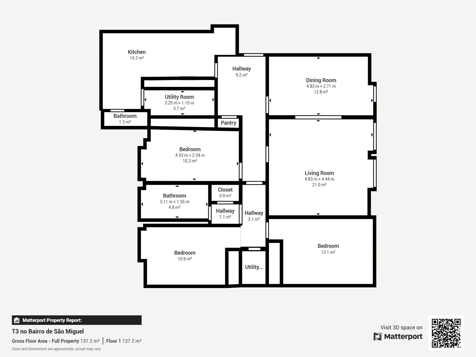 Esta casa é constituída por 3 quartos (dois dos quais com roupeiros embutidos), 1 sala de jantar ligada por arco à sala de estar, 1 ampla cozinha equipada com frigorifico, esquentador, fogão, forno, máquina de lavar loiça e máquina de secar a roupa , 1 quarto interior rodeado de roupeiros, 2 WCs, 1 armário/rouparia, 1 roupeiro/sapateiro, 1 armário bengaleiro e uma VARANDA com 9m2.